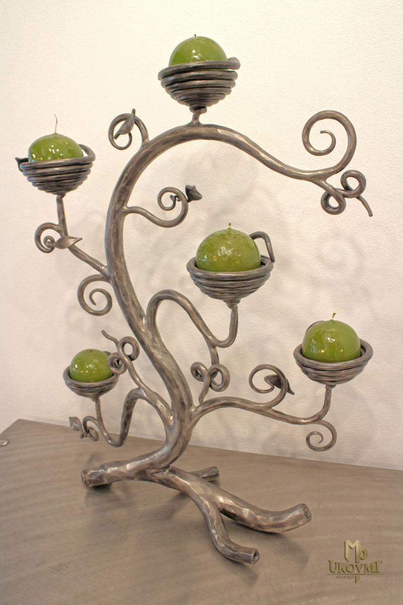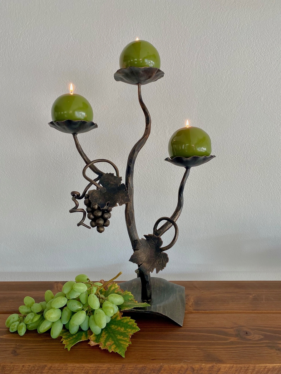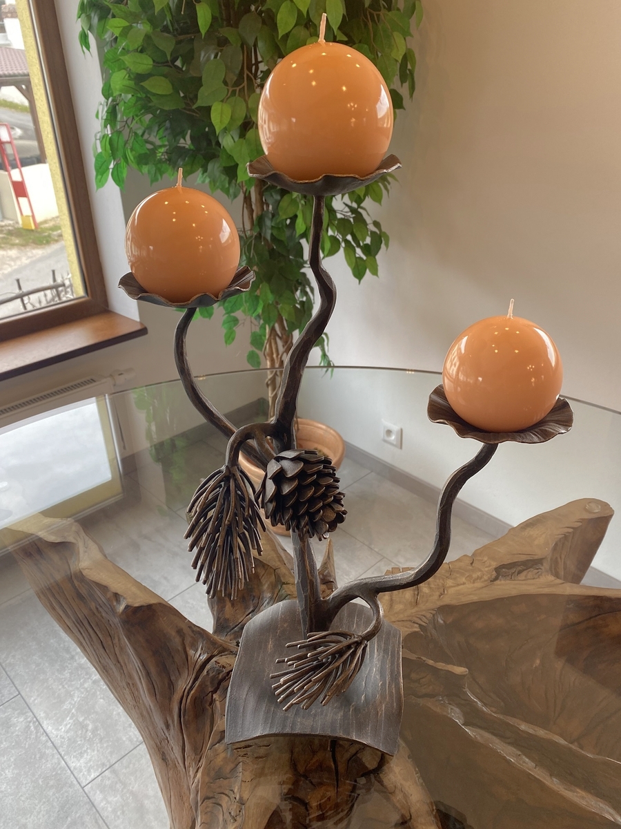 Každý svícen je originál, vytvořený zkušenými kováři. Dub symbolizuje sílu, réva hojnost a radost, a borovice klid a stálost.