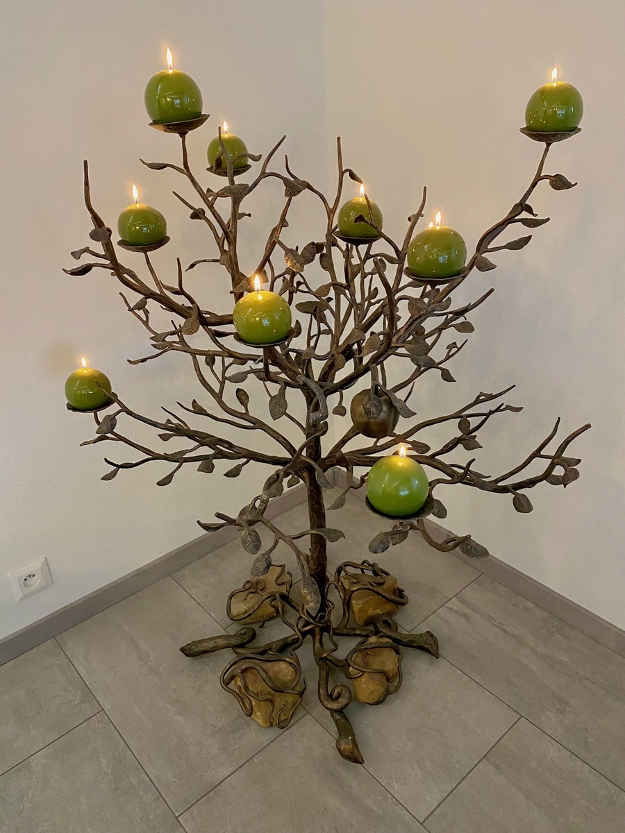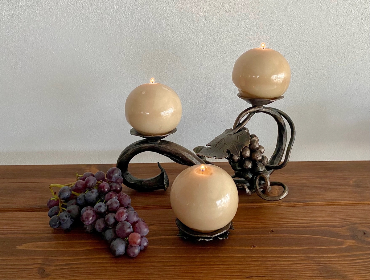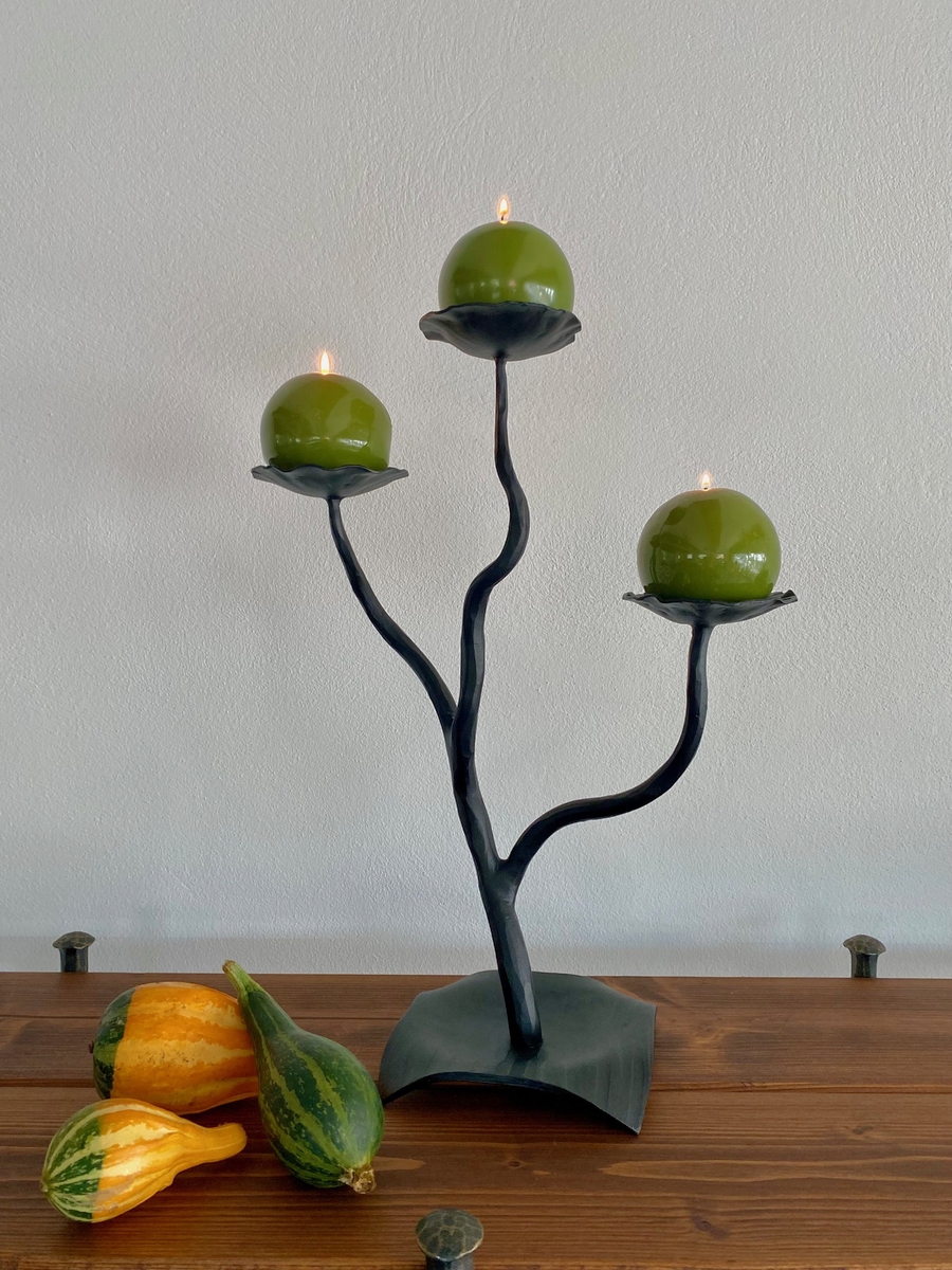 Každý svícen je originál, vytvořený zkušenými kováři. Dub symbolizuje sílu, réva hojnost a radost, a borovice klid a stálost.