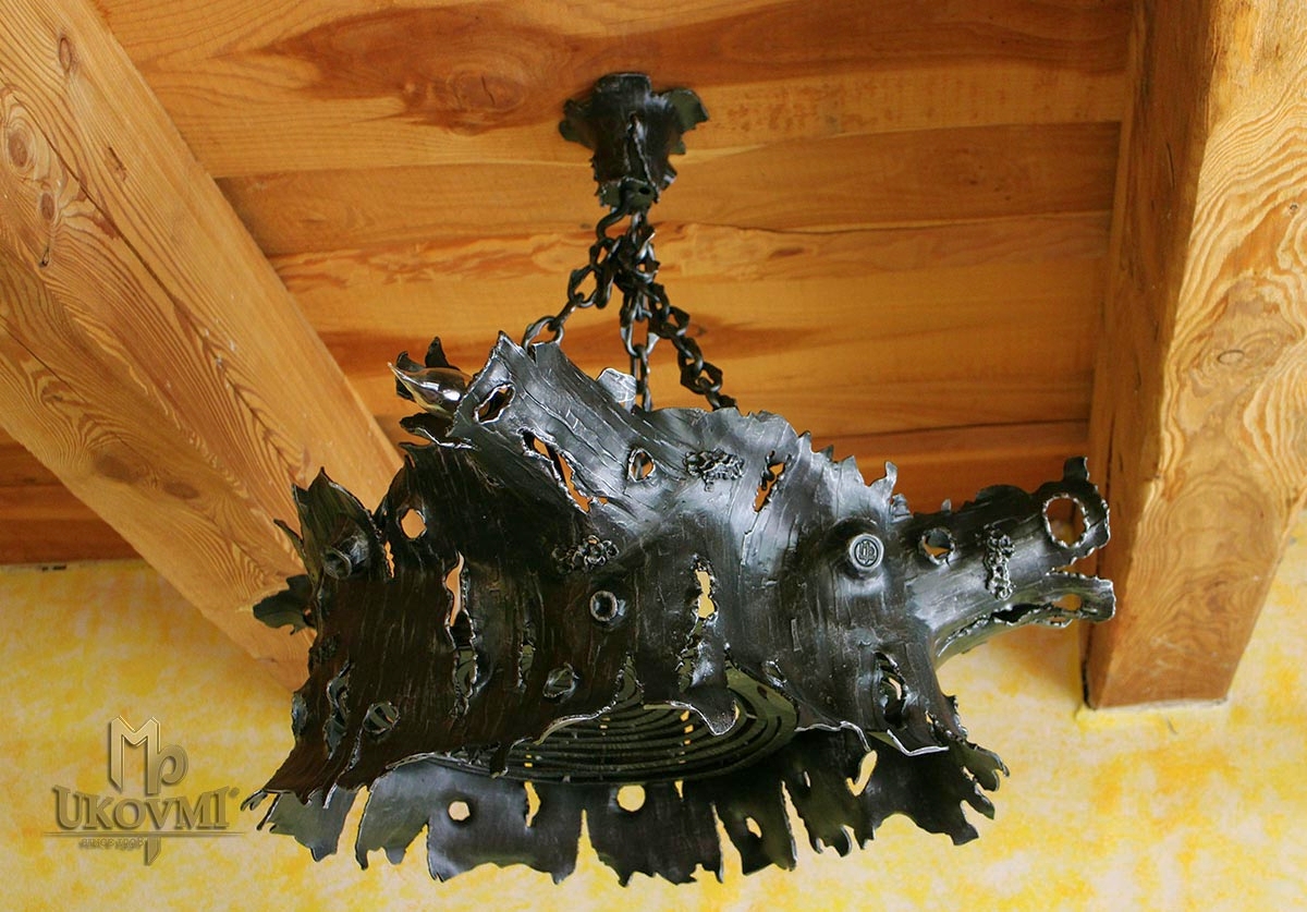 Kovaný lustr Dub - interiérový lustr zavěšený na kované řetězu - výjimečné svítidlo do altánku, na chalupu ...