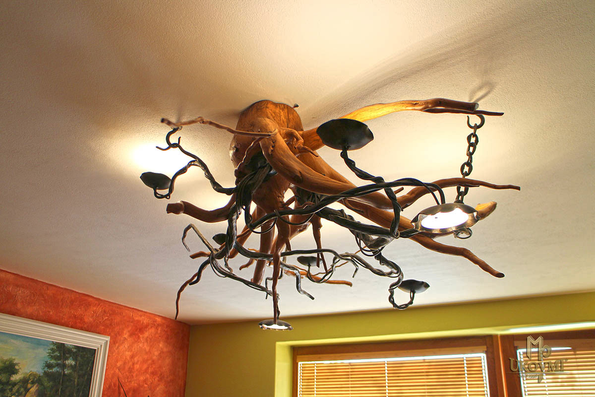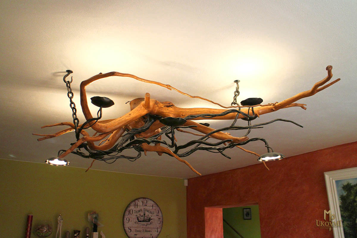 Dubové originální svítidlo s ručně kovanými spirálkami - umělecké svítidlo