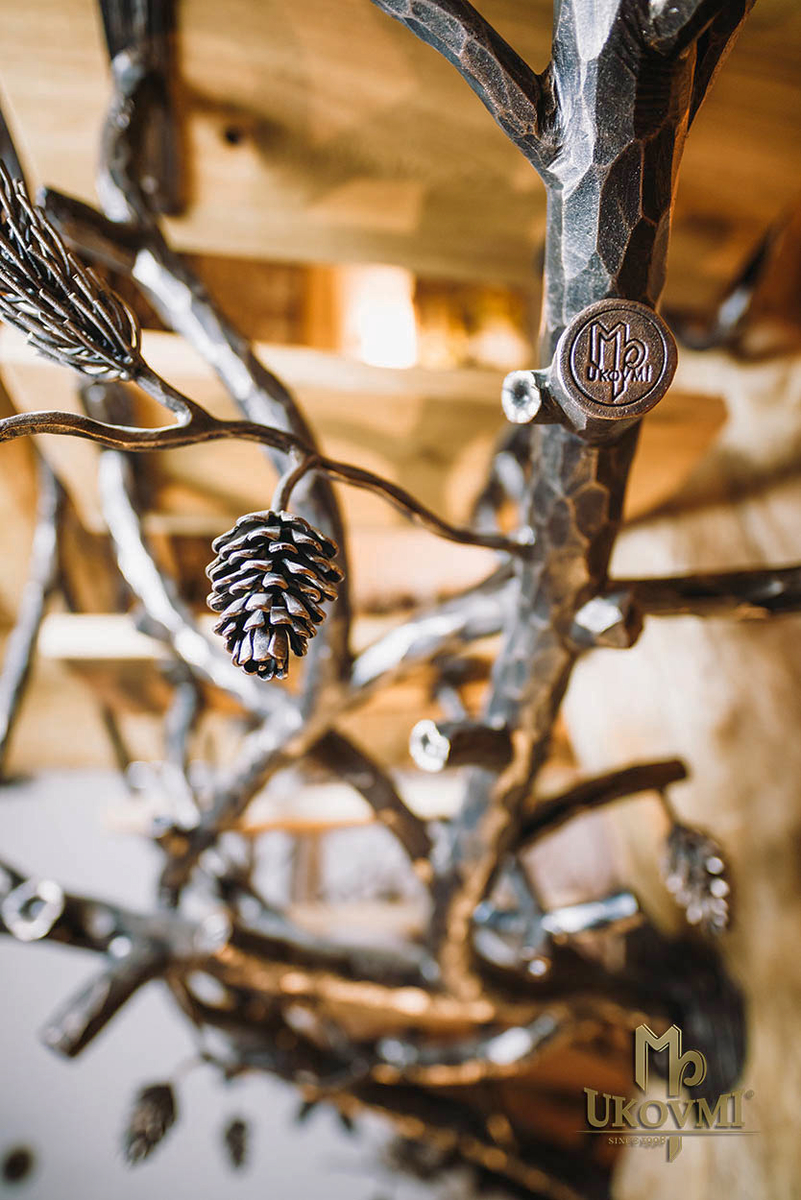 Výnimočné ručne vykované zábradlie do interiéru s prírodným motívom - Strom-sosna - detail zábradlia s logom UKOVMI