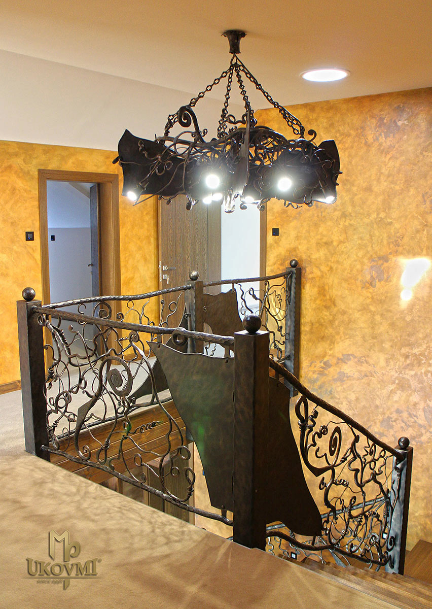 Výnimočné zábradlie - ručne kované interiérové zábradlie na schodisko - Korene a originálny luster Netopier