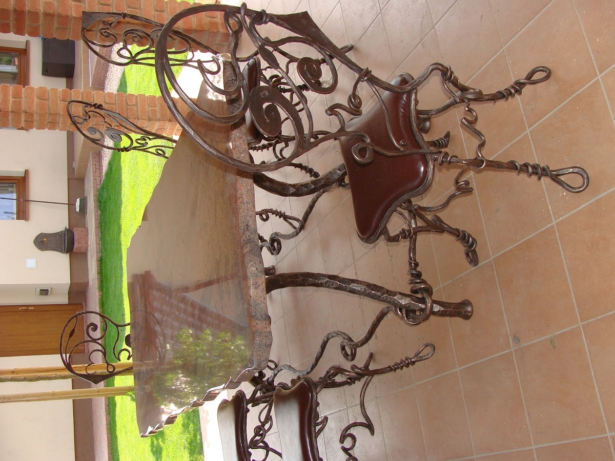Masívny dubový stôl so sklom, ručne kovaným podstavcom a stoličkami - luxusný nábytok